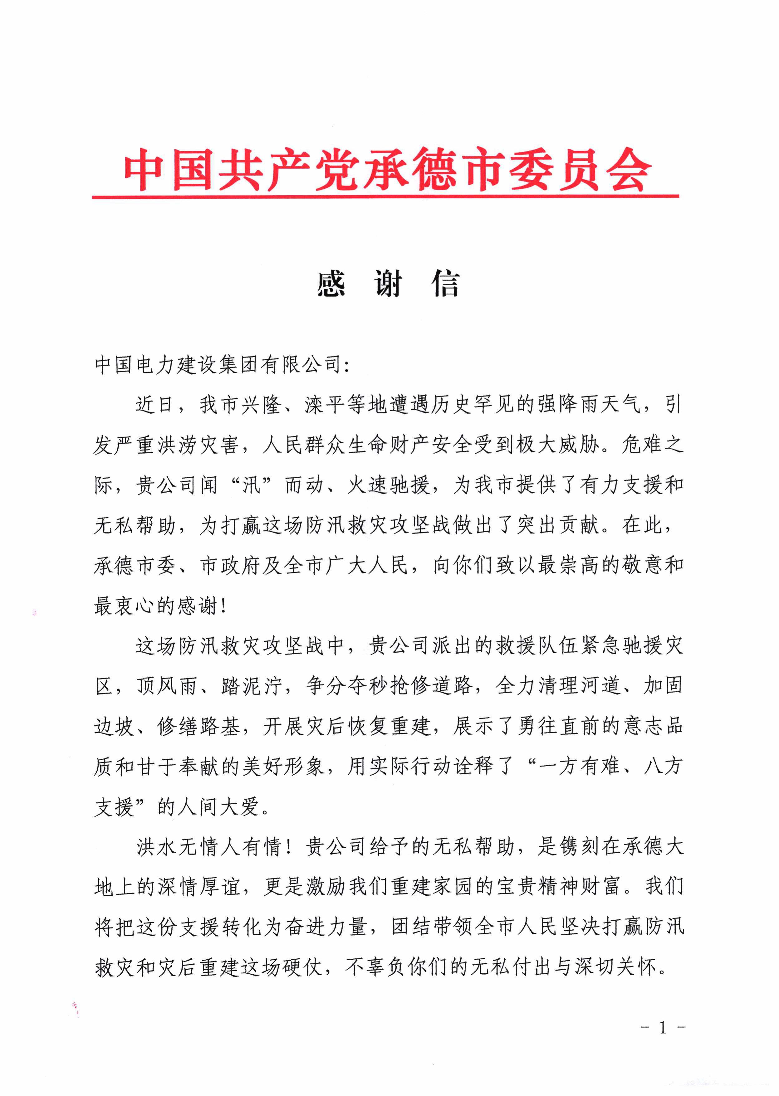 8月15日,公司收到來自河北省承德市委、市政府的感謝信。信中指出,中國電建在危難之際,聞“汛”而動、火速馳援,頂風雨、踏泥濘,爭分奪秒搶修道路,全力清理河道、加固邊坡、修繕路基,開展災后重建,為興隆縣防汛救災和災后恢復重建工作提供了有力支援和無私幫助,承德市委、市政府對公司在搶險救災中展現的專業素養與責任擔當給予高度贊揚,并致以衷心感謝。 近期,承德市興隆縣遭遇歷史罕見的強降雨天氣,引發嚴重山洪災害。中國電建黨委迅速響應,在短短24小時內完成了43臺挖機、鏟車等大型設備以及工程技術人員的跨省調運和增配,第一時間支援災區。11天時間里,中國電建累計搶通六道溝村、羅圈廠村、思家嶺村、趙北溝村以及557鄉道等重災區道路71公里,修復路基9400米,治理邊坡7900米,清理河道內巨石、倒伏樹木及淤積物18500立方米,高效完成搶險救災和災后援建工作。 在救災第一線,中國電建緊急成立前方指揮部,堅持“日調度、日報告”制度,將搶通任務細化分解至各作業點,確保指令暢通、效率最大化。現場施工采用“分段包保、多點同步、壓茬推進”的方式,多支精銳力量協同作戰,為救援物資運輸和群眾生活恢復提供了堅實的交通保障。援建工作結束后,興隆縣交通運輸局,思家嶺村、羅圈廠村、六道溝村、趙北溝村村委會也分別向中國電建致信感謝。 汛情就是動員令,險情就是沖鋒號。自7月我國全面進入主汛期以來,多地汛情不斷,嚴重威脅人民群眾的生命財產安全。面對突發重大自然災害,中國電建黨委高度重視,第一時間積極調配力量,組織參與搶險救援。公司所屬水電十一局、水電十四局、電建生態公司、電建港航公司、電建地產公司等15家子企業,積極響應當地政府緊急求援,在北京、河北、河南、陜西、甘肅、內蒙古、青海、湖北、廣東、云南、貴州、福建等地,共組織工程技術人員1739人,出動挖機、鏟車、渣土車等機械設備689臺套,全力投入道路搶修、淤泥亂石清理、邊坡加固、消殺等任務中,以實際行動彰顯央企責任與擔當,陸續收到來自北京市人民政府,東莞市委、市政府等多封感謝信。 |