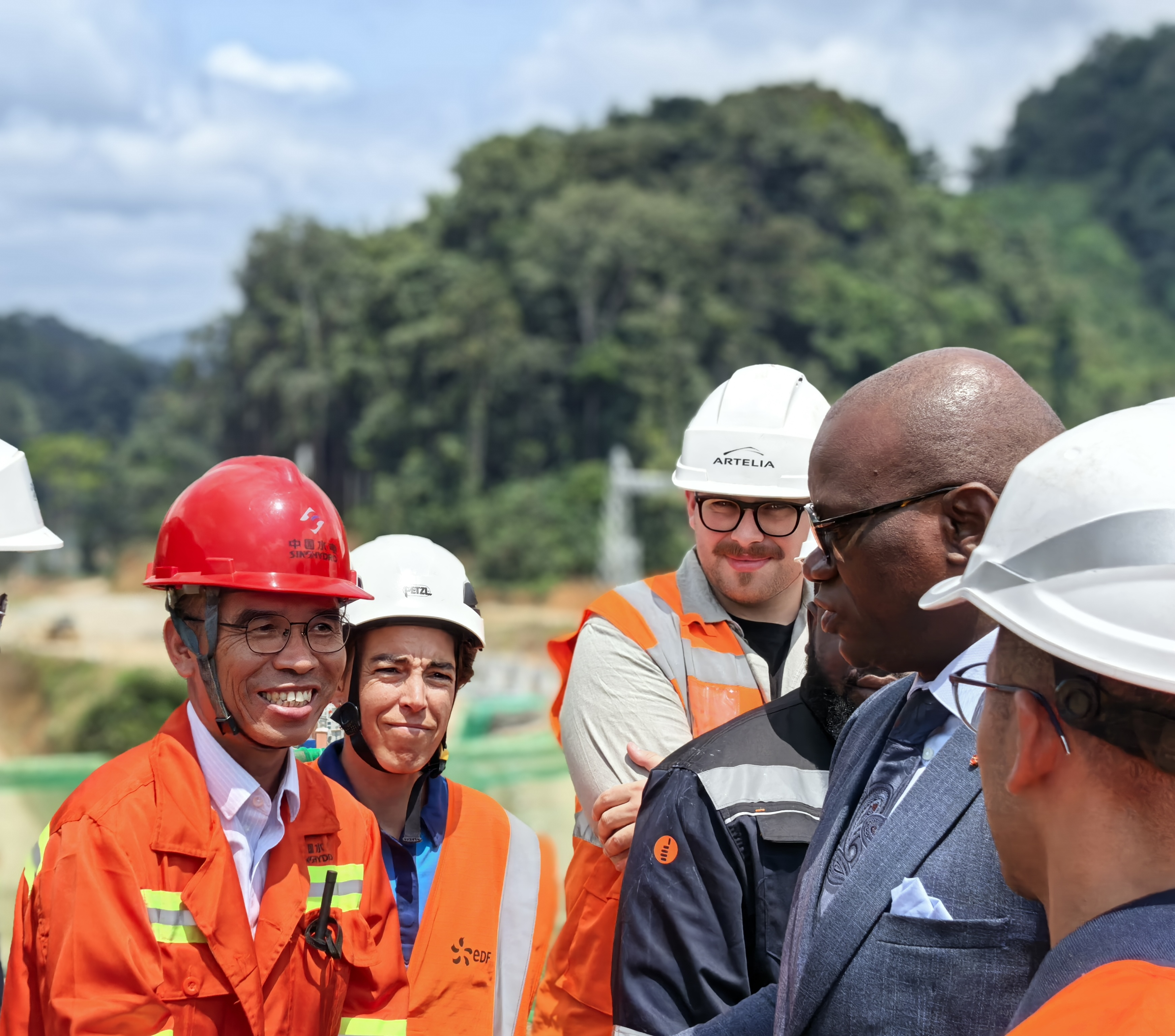 恩圭馬總統(tǒng)一行參觀了大壩施工區(qū)、電站廠房等區(qū)域,詳細(xì)了解了工程進度、技術(shù)應(yīng)用及質(zhì)量管控等情況。恩圭馬總統(tǒng)向一線建設(shè)者致以慰問,高度肯定了該項目對緩解加蓬首都利伯維爾大區(qū)當(dāng)前電力供應(yīng)壓力、保障民生用電穩(wěn)定以及推動經(jīng)濟社會發(fā)展的戰(zhàn)略價值,并贊揚了中國電建在促進屬地就業(yè)、帶動中小企業(yè)參與國家重點工程方面做出的貢獻。