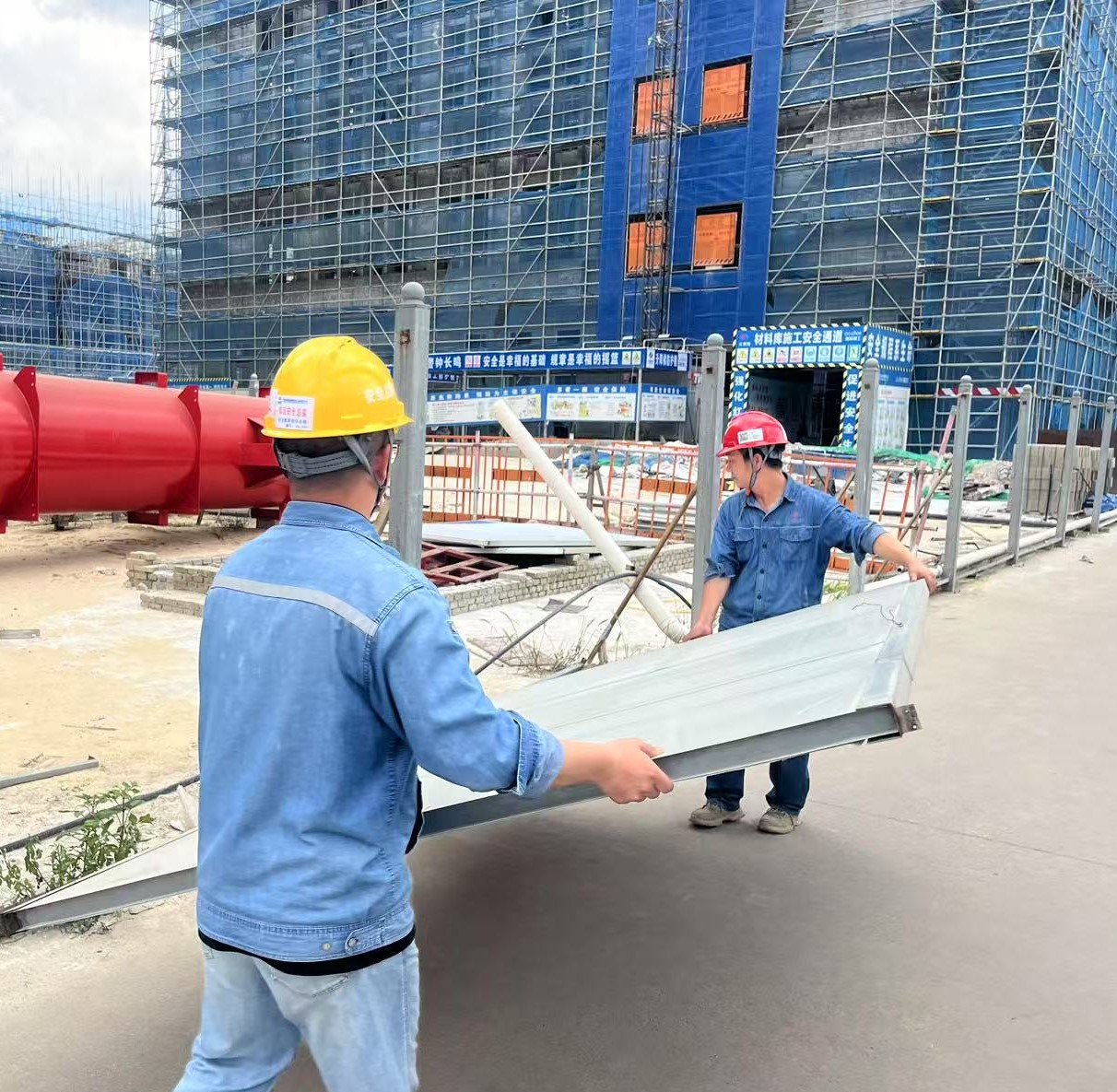 8月12日,接到防臺風應急響應后,項目部第一時間召開緊急會議,明確責任分工,部署防臺防汛工作,確保各項防御措施落實到位。項目部全體人員爭分奪秒與“楊柳”賽跑,全程現(xiàn)場巡查、督導開展防御工作,及時排除隱患,確保防風措施嚴格落實。全面拆除密目網(wǎng)、圍擋、標志標牌等易飛物品,仔細檢查塔吊、腳手架、配電箱等設備工具,加固鋼筋加工棚、集裝箱地錨拉線,全面排查辦公區(qū)、生活區(qū),嚴格執(zhí)行徹底斷水、斷電、斷汽要求。與此同時,項目部速組織全體人員及工人有序撤離,并妥善安置到指定居住地,確保“一個不少、一個不落”。
