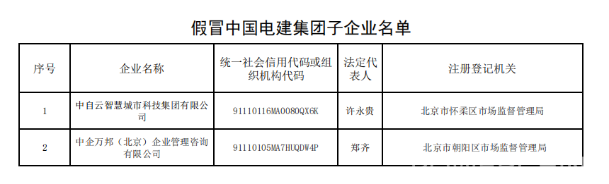 長期以來,有不法分子通過偽造相關材料等方式,將企業注冊為中國電建集團下屬子公司,以中國電建集團下屬子公司名義開展業務。經我集團核實,以下公司及其下設各級子公司均為假冒國企,與中國電建集團無任何隸屬或股權關系,也不存在任何投資、合作、業務等關系,其一切行為均與中國電建集團無關。請社會各界提高警惕,注意防范風險,如發現其違法犯罪行為,請盡快到公安機關報案。